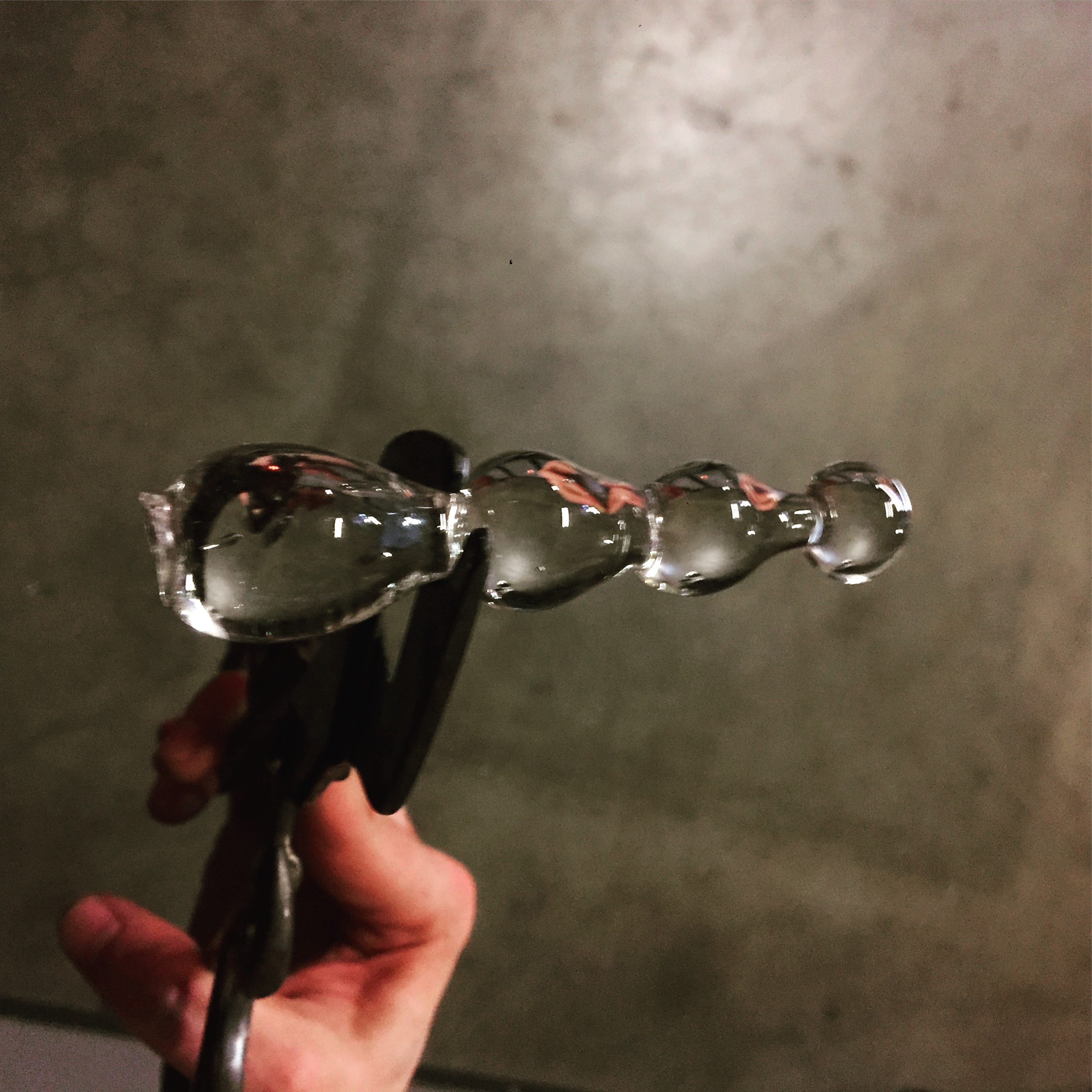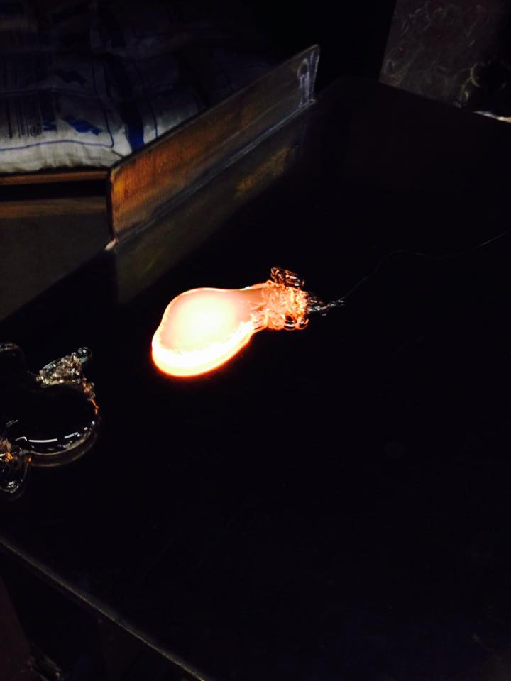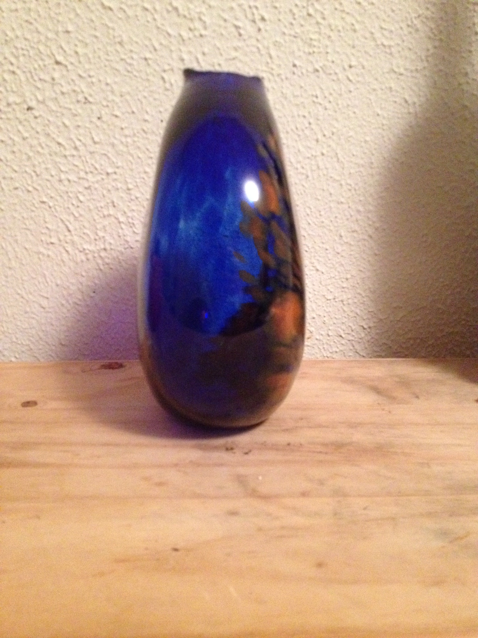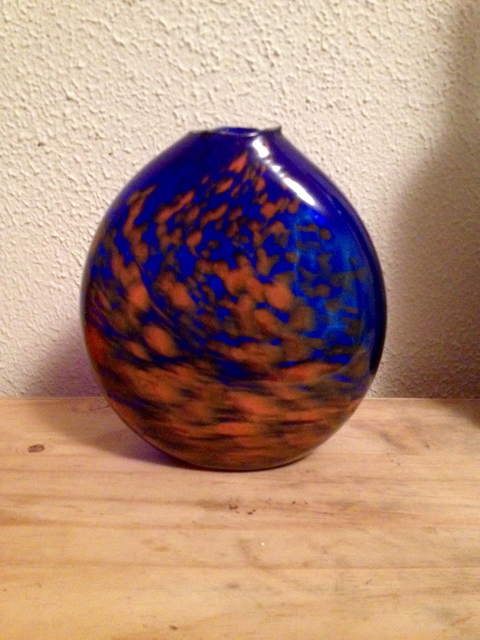 Overview: This collection represents early glass play, with all pieces made at MarrsArt Glassblowing Studio. The blue and orange vase was my first foray into glass blowing. I made this vase by blowing and spinning to get the basic globe shape, and then by using cork paddles to change the one axis to be thinner from front to back. I left the top unground to show that it is handmade. Most recently, I’ve been practicing working with different styles of jack and creating necklines. The latest glass piece still in progress. Next, I’d love to find the right leather for the hanging straps and then imagine some moss balls hanging out inside.