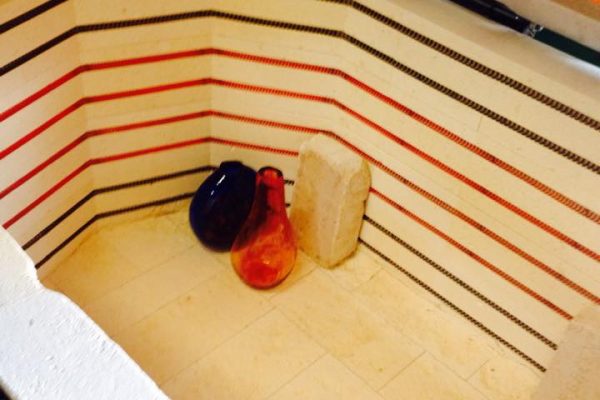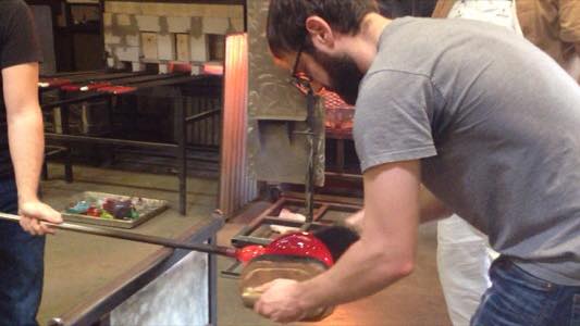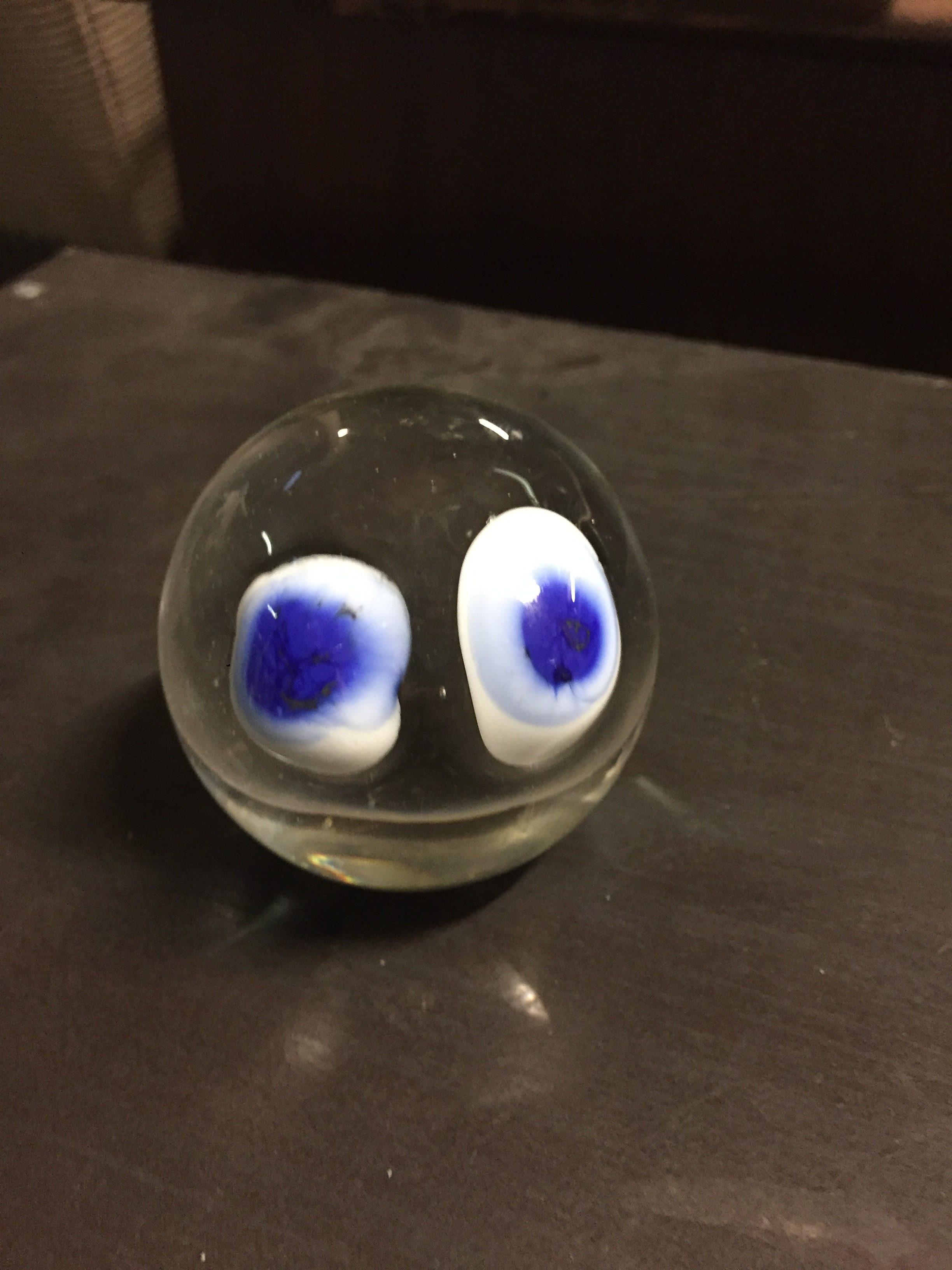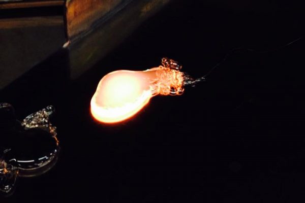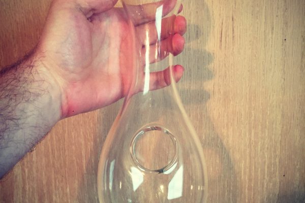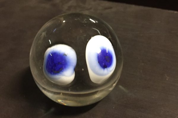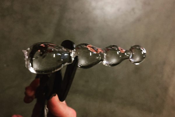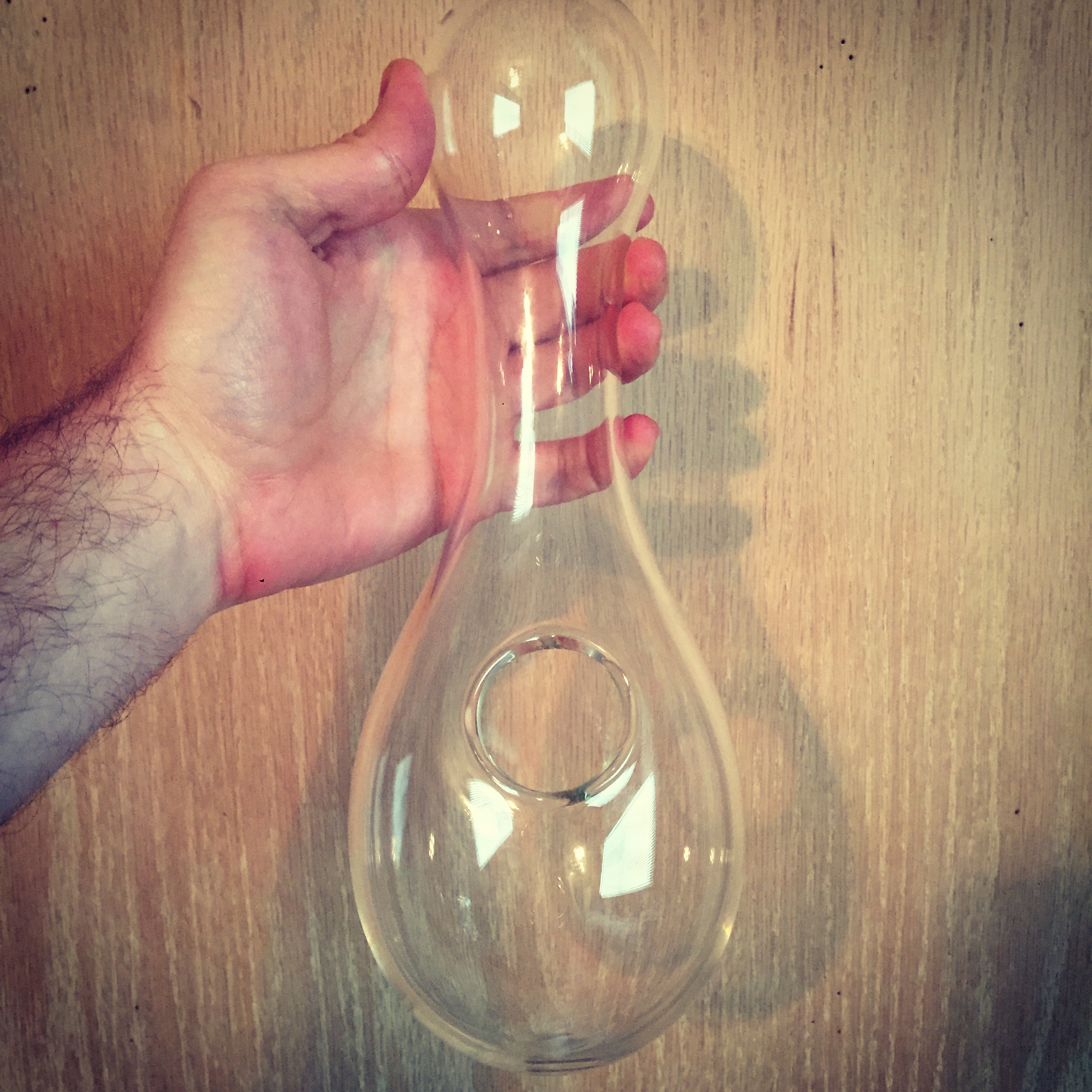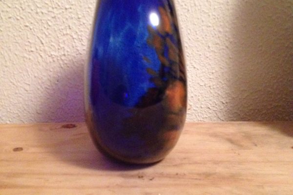 Overview: This collection represents early glass play, with all pieces made at MarrsArt Glassblowing Studio. The blue and orange vase was my first foray into glass blowing. I made this vase by blowing and spinning to get the basic globe shape, and then by using cork paddles to change the one axis to be thinner from front to back. I left the top unground to show that it is handmade. Most recently, I’ve been practicing working with different styles of jack and creating necklines. The latest glass piece still in progress. Next, I’d love to find the right leather for the hanging straps and then imagine some moss balls hanging out inside.