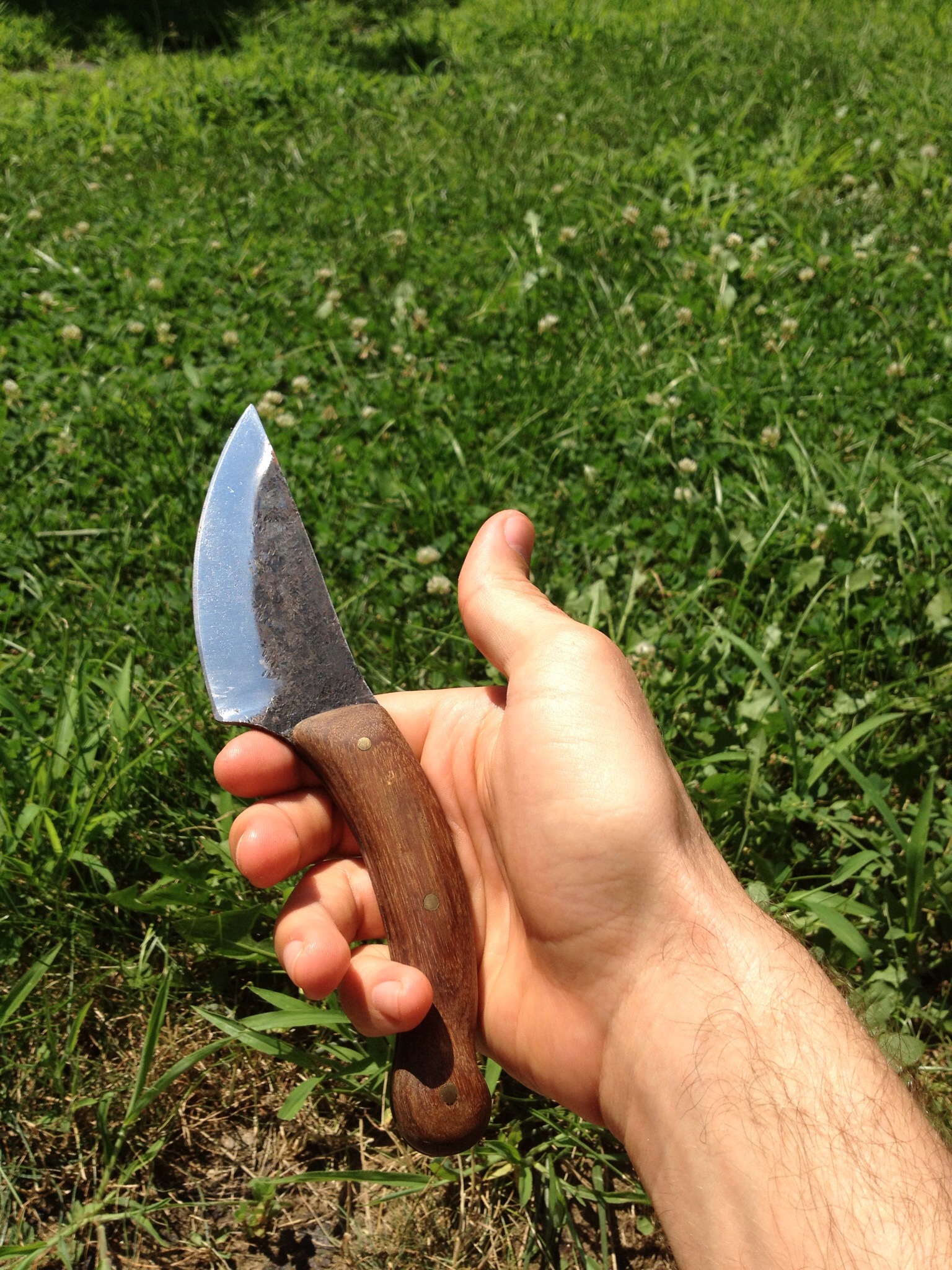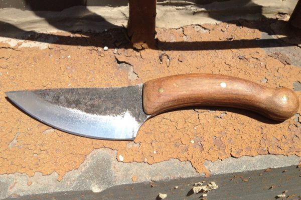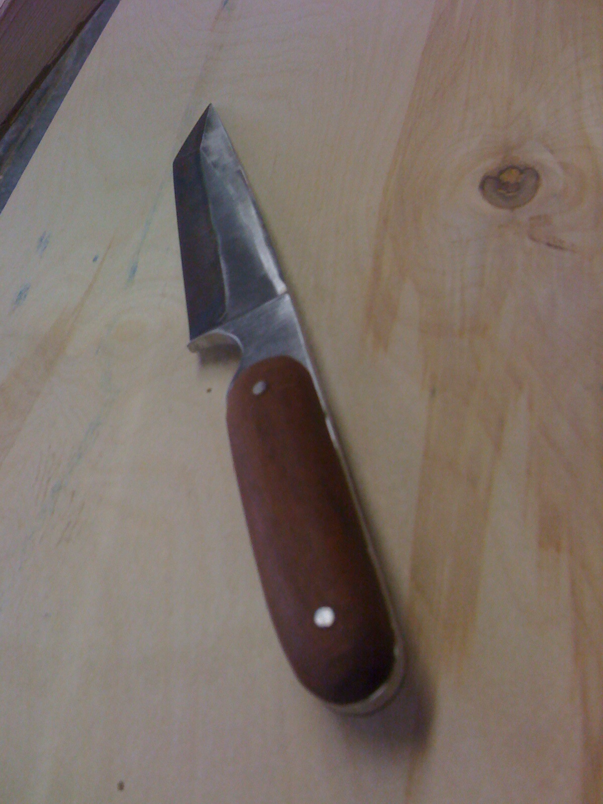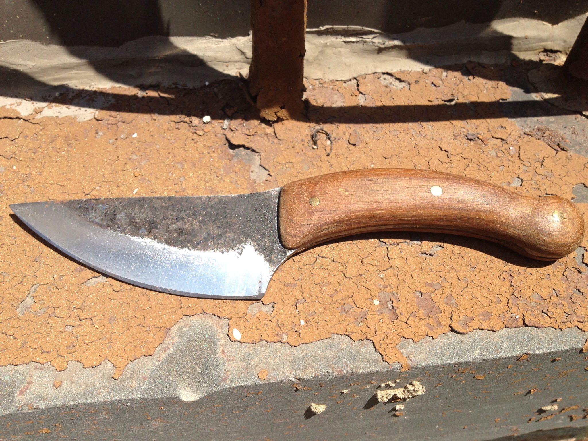 Overview: These knives came out of my interest in the process for making a functional and beautiful knife using discarded materials like high carbon lawn mower blades and old metal files. I began by heat soaking the metal and cutting the basic shape on a bandsaw. The blade profiles and edges are shaped using a belt sander. Wood handles are shaped using files or a belt sander and then attached with rivets.