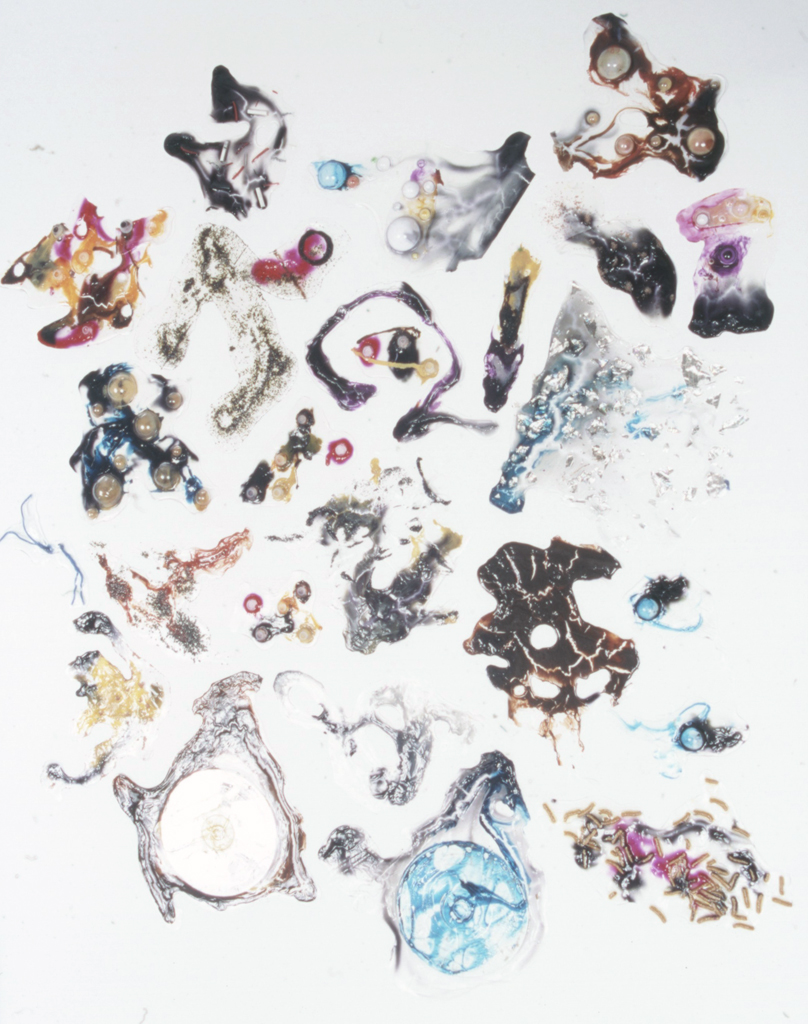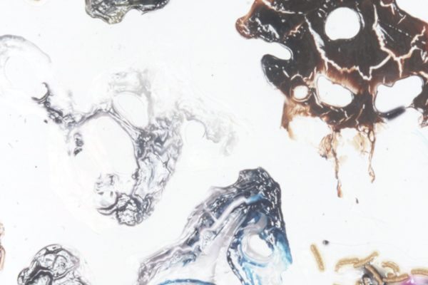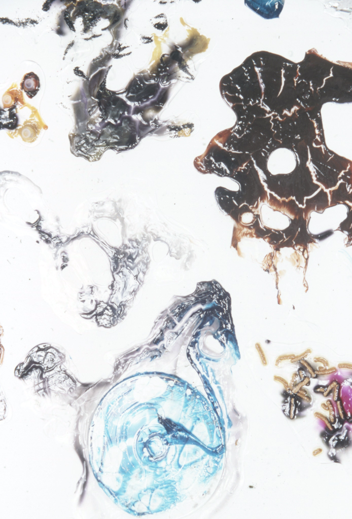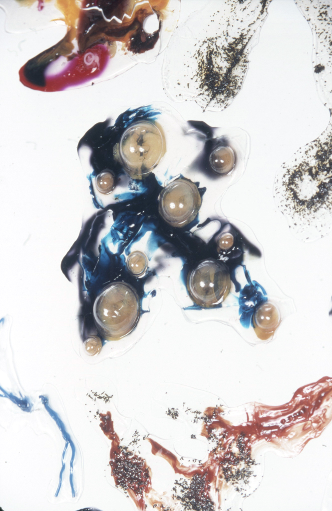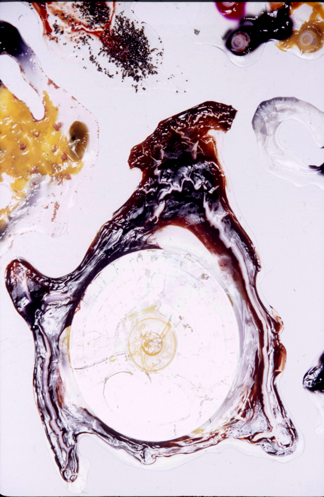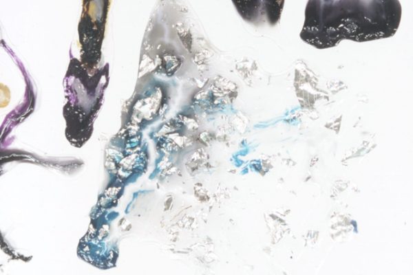 Overview: I have a BFA degree in Drawing and Painting. My passion for painting in mixed media began with a love for watercolour, and ended with a passion for material play. The first image is a close up detail shot of my play with dripping vibrant inks into clear acrylic mediums and experimenting with the addition of various found objects. The second image is not a single piece; it consists of 100 variations of clear acrylic play.