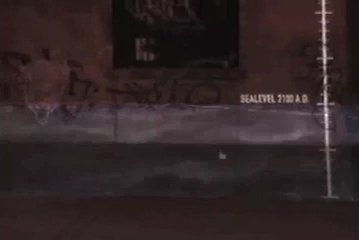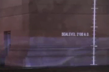 Overview: Sealevel 2100 came about from seeing government data for projected sealevel increases by the year 2100A.D. Chuck Yust and I decided to make a graffiti style performance/awareness campaign using a 480p video projection of water and the level in metres at a determined location, and to leave behind an artifact of a blue and white chalk line and the tag “Sealevel 2100 A.D.” in wax at the projection sites. Watch Video.